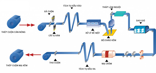 Quá trình mạ kẽm trải qua nhiều bước, nguyên liệu đầu vào là thép cuộn cán nóng phải qua công đoạn vệ sinh bề mặt trước khi đi vào mạ kẽm. Cụ thể các bước như hình bên dưới